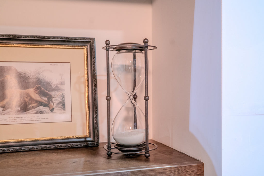 Add a touch of timeless elegance to your space with this beautifully crafted hourglass. Designed as both a decorative piece and a subtle timekeeper, it features finely blown glass and smooth-flowing sand encased in a sleek metal frame . Whether placed on a bookshelf, coffee table, or office desk, this hourglass brings a sense of calm and sophistication to any room.