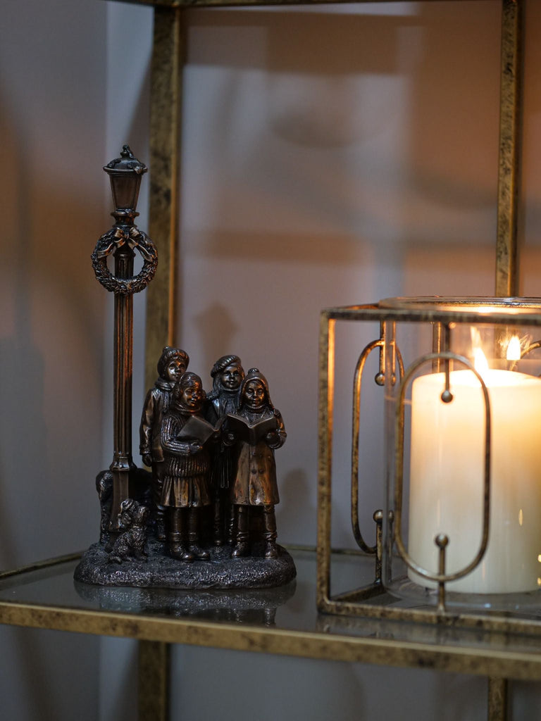 - Antique gold metal frame candle holder with glass hurricane inlay.