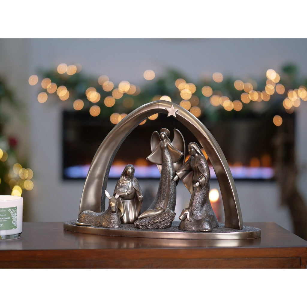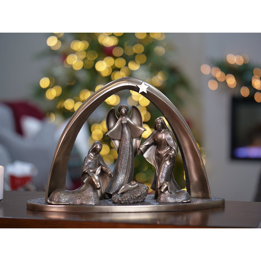 - A hand crafted bronze nativity scene including angel that brings to life the story of Christmas.