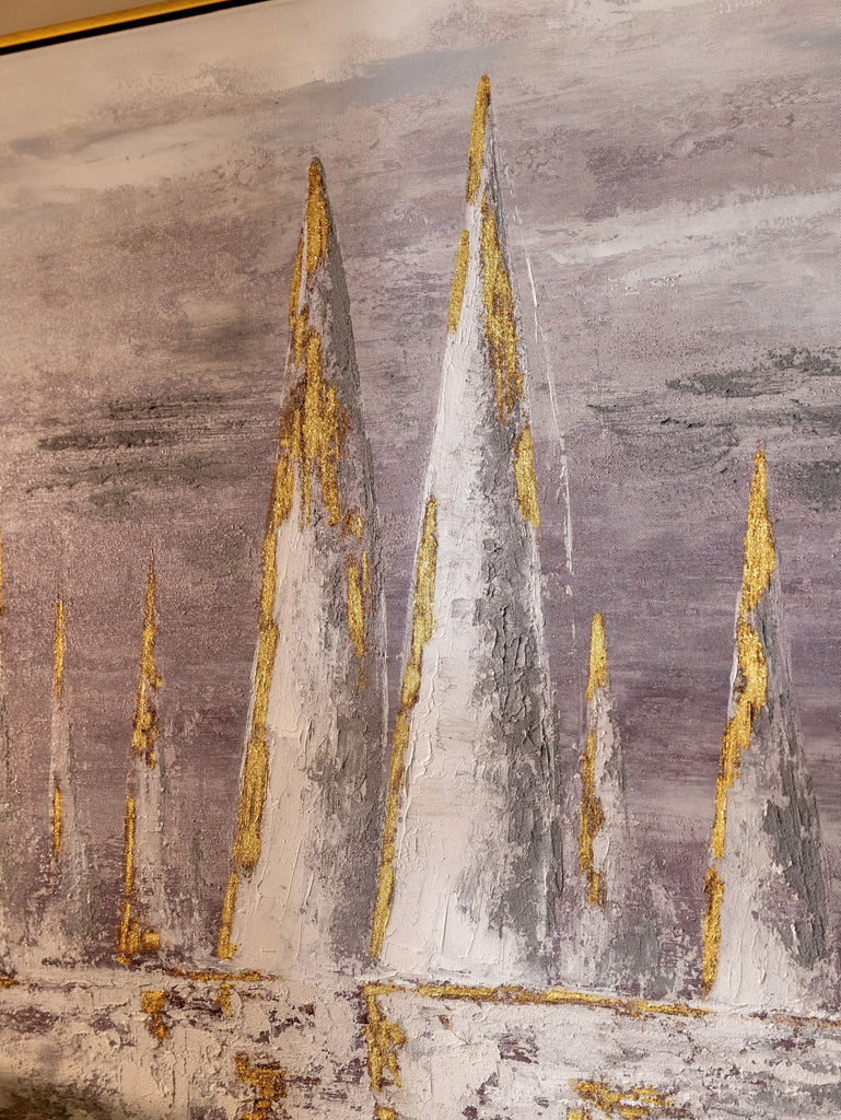 - A stunning modern gold framed canvas, wall art depicting an abstract and textured mirage of boats in greys and off whites tones with bright gold accents.