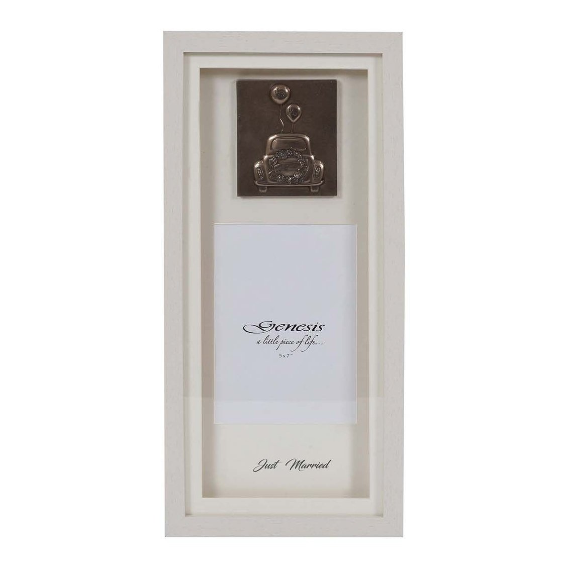 - A gorgeous faux blond wood frame, showcasing the classical just married car in cast bronze with a space for a 5x7'' photo and the inscription, "Just Married" at the bottom of the frame.
