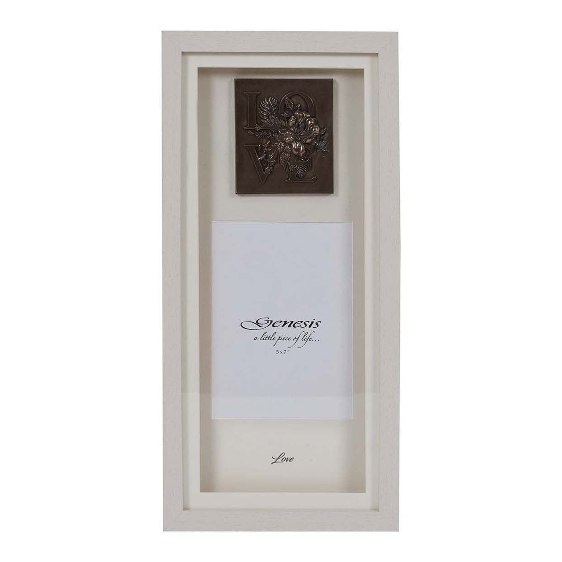 - A gorgeous faux blond wood frame, showcasing the word "Love", encased in a beautiful flower display, in cast bronze with a space for a 5x7'' photo and the inscription, "Love" at the bottom of the frame.