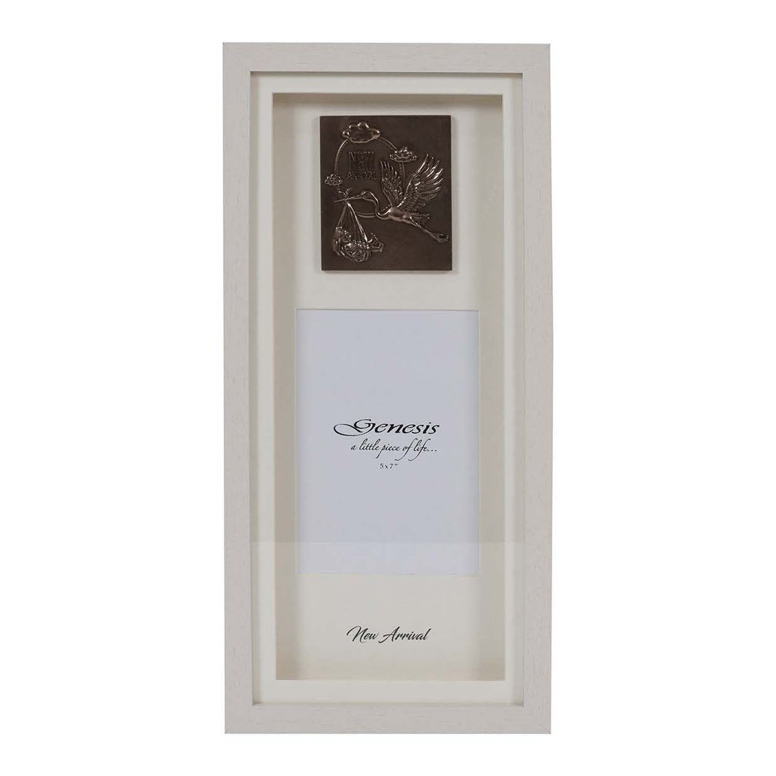 - A gorgeous faux blond wood frame, showcasing the stork's arrival in cast bronze with a space for a 5x7'' photo and the inscription, "New Arrival" at the bottom of the frame.