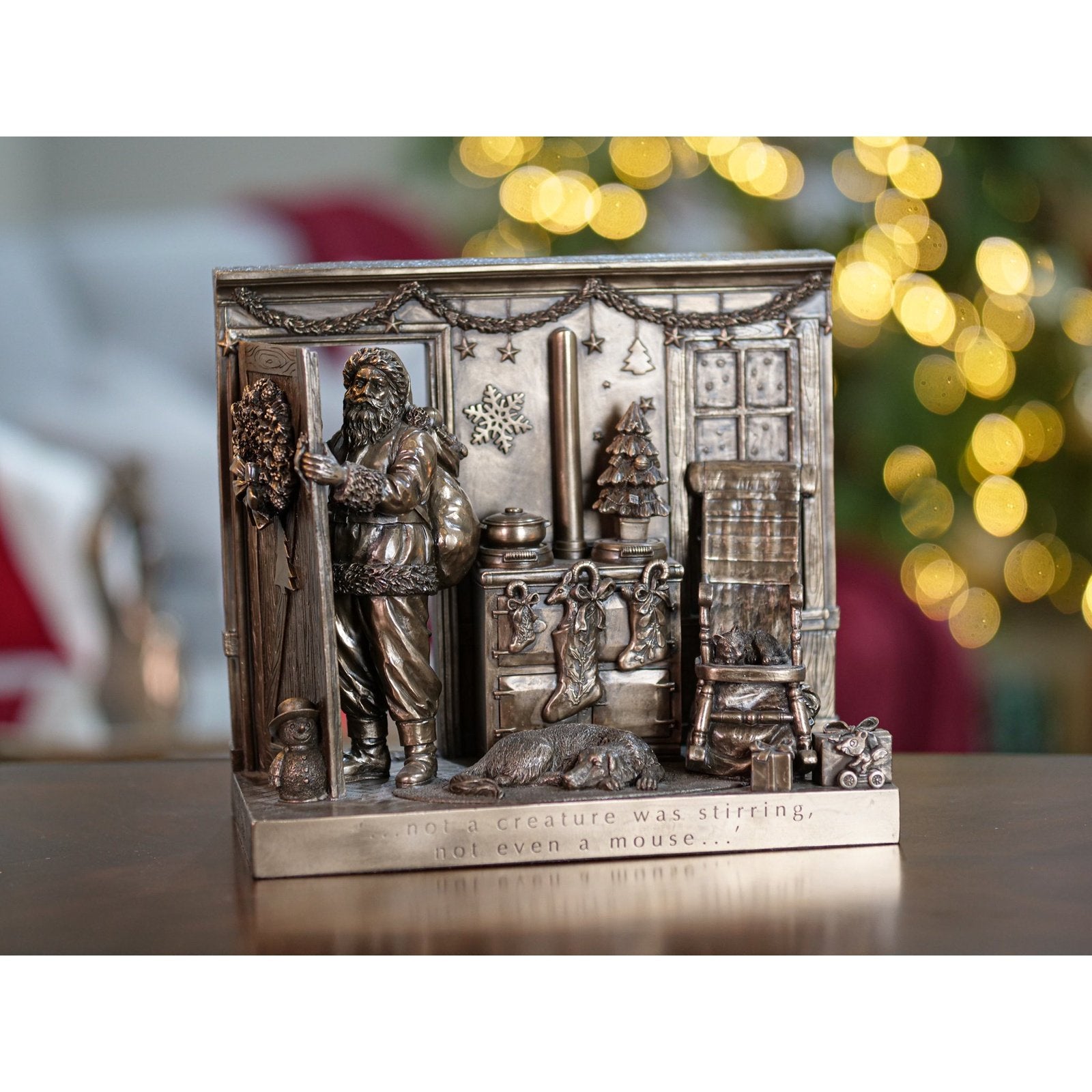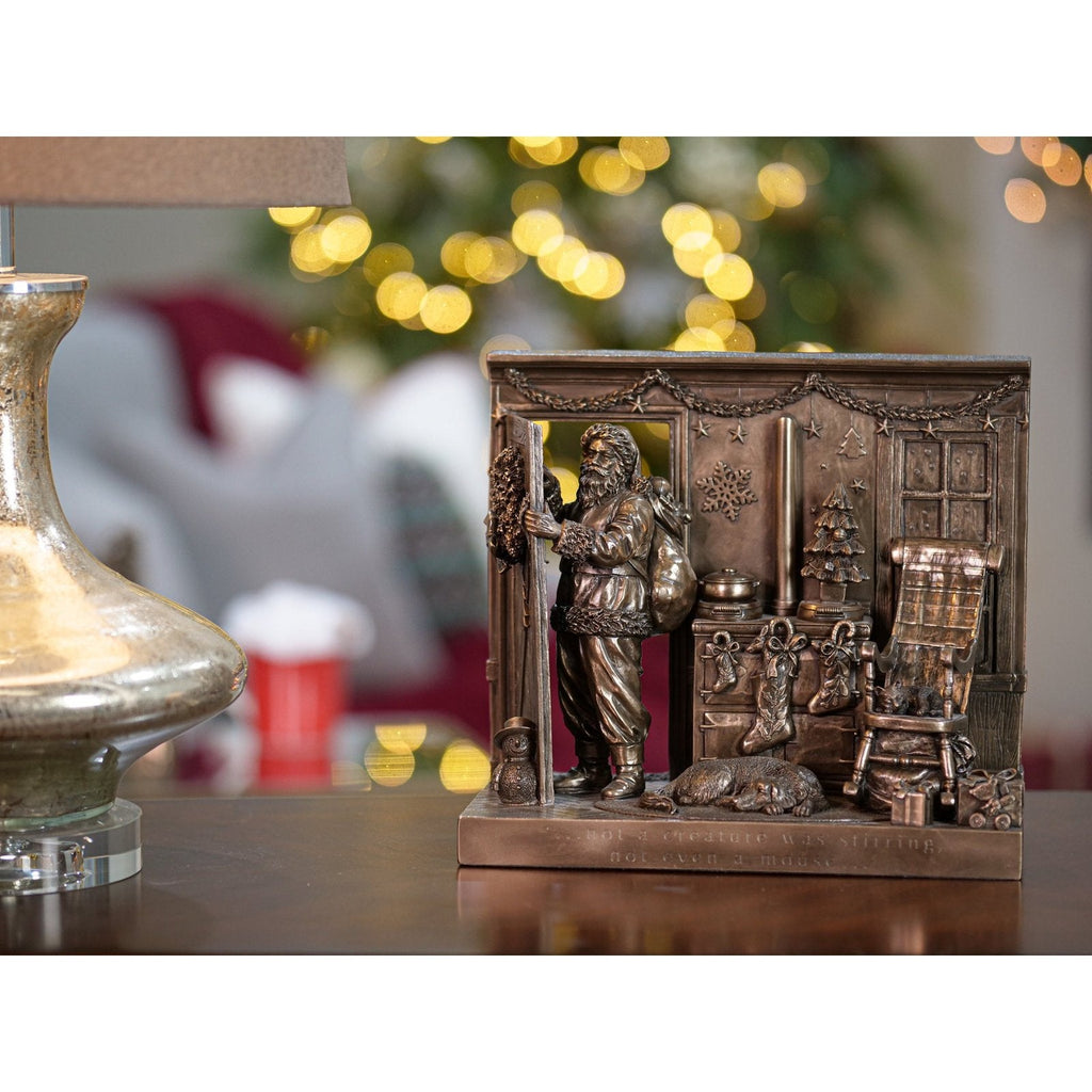 - Beautifully crafted in cold cast bronze, this Christmas scene incorporates Father Christmas and his bag of toys leaving the scene after filling the stockings for Christmas.
