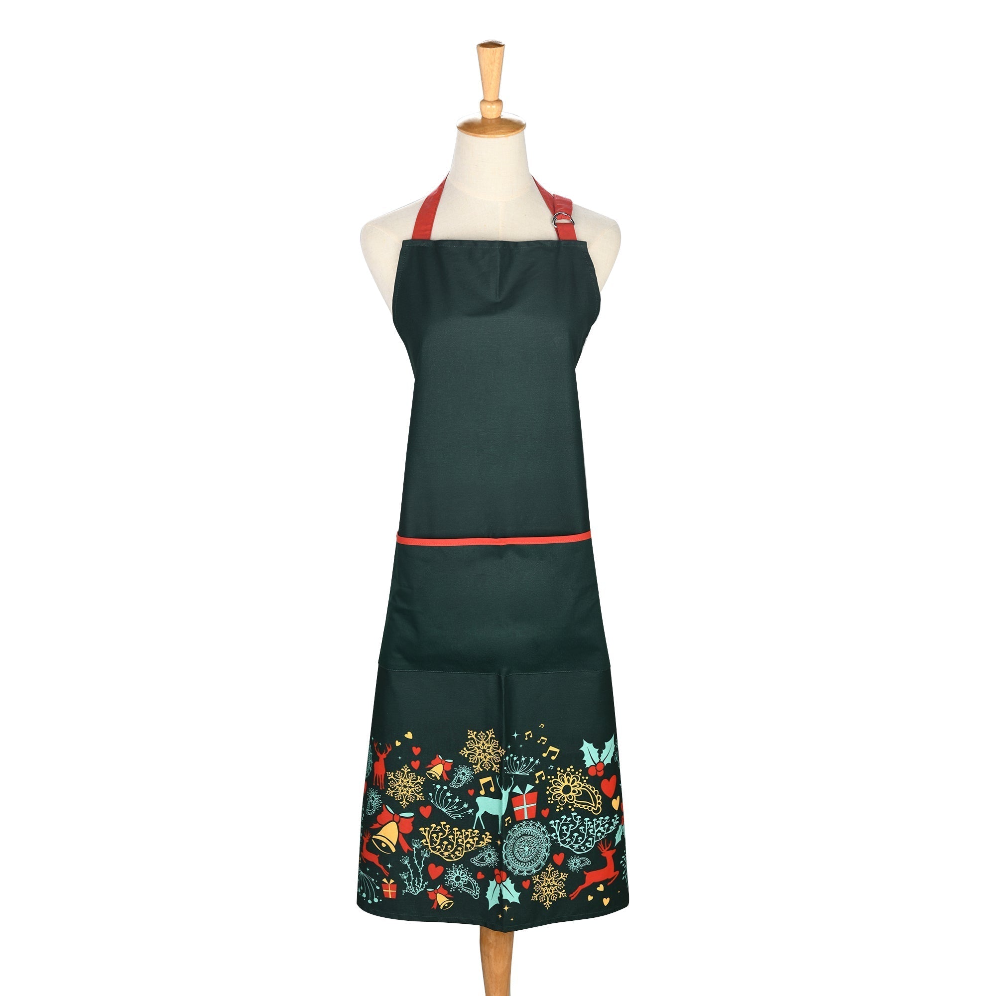 - A beautiful¶ÿapron finished in forest green with a Christmas design that¶ÿdepicts¶ÿsome of Christmas' key elements, such as reindeer, presents, music notes, and more.
