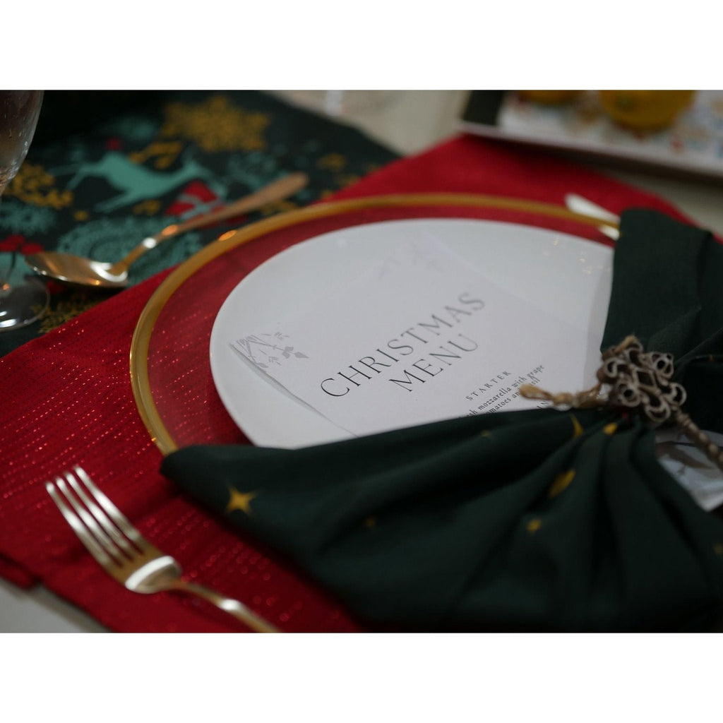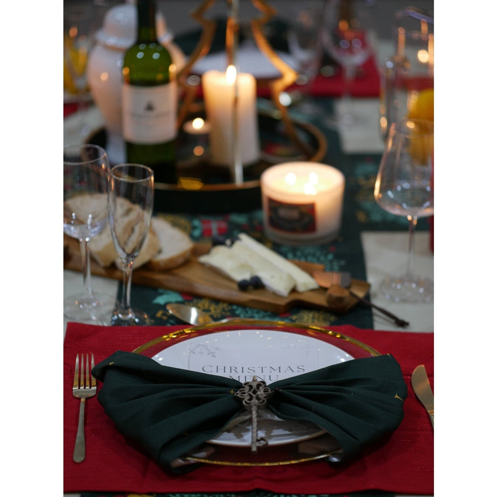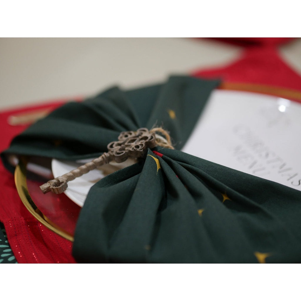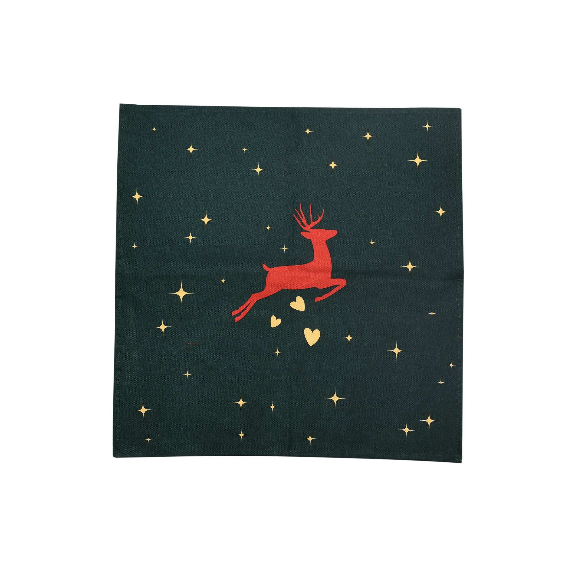 • ¶ÿA beautiful set of four napkins finished in forest green with a Christmas design that¶ÿdepicts a red reindeer and gold stars and hearts.¶ÿ