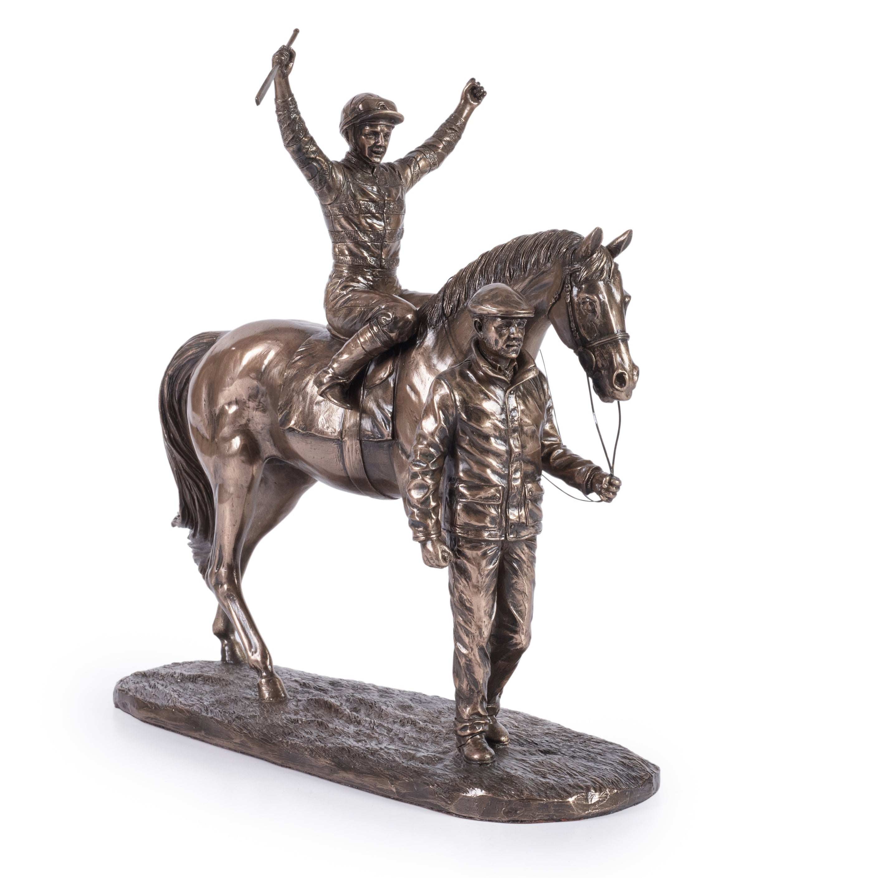 Capture the thrill of triumph with this dynamic sculpture featuring a jockey celebrating victory atop a proud racehorse, led by a steady handler. A striking tribute to teamwork and achievement in the world of horse racing.